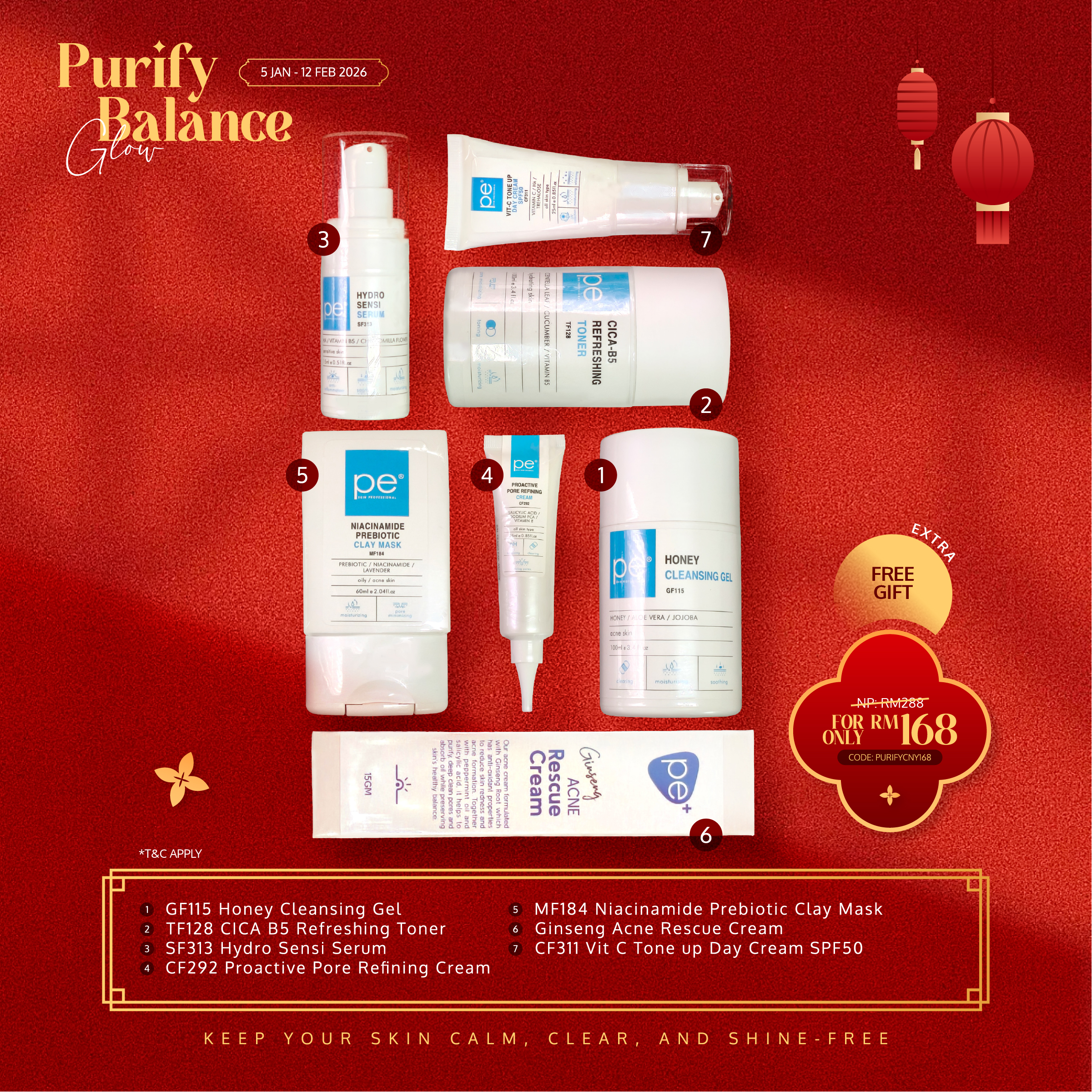 For: Oily, Acne-Prone & Congested Skin 1. GF115 Honey Cleansing Gel - 100ML 2. TF128 Cica-B5 Refreshing Toner - 100ML 3. SF313 Hydro Sensi Serum - 15ML 4. CF292 Proactive Pore Refining Cream - 25ML 5. MF184 Niacinamide Prebiotic Clay Mask - 60ML 6. PE+ Ginseng Acne Rescue Cream - 15ML 7. CF311 Vit-C Tone Up Day Cream SPF50 - 25ML A complete festive routine with 7 skincare essentials worth up to RM168! Promotion ends 12 February 2026 ✨🐎